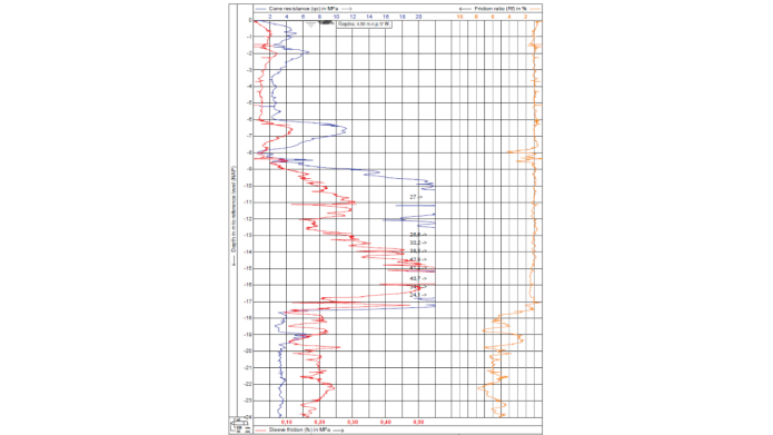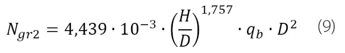 Badania prowadzone przez Meyera i Stacheckiego [10, 11, 15] opisują sposób ustalenia zmiany wartości parametrów M-K, czyli C2; κ2; Ngr2; C1; κ1; Ngr1 w przypadku zmiany średnicy i długości pala. Najważniejszy z parametrów, decydujący o bezpieczeństwie konstrukcji, czyli nośność graniczna pala, został wyznaczony na podstawie empirycznej zależności [11, 15] ustalonej na podstawie próbnych obciążeń statycznych, przeprowadzonych w pełnym zakresie obciążenia dla siedmiu pali CFA o znacznych długościach, dochodzących do ok. 30 m oraz średnicach 1-1,5 m. Przykładowy rozkład sondowania CPTU dla jednego z analizowanych pali przedstawiono na rys. 4. Na głębokości podstawy pali zalegają gliny pylaste i iły pylaste. W ostatecznej postaci można zapisać równanie:
