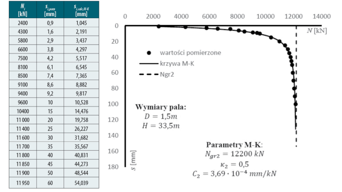 Rys. 5. Wyniki próbnego obciążenia statycznego dla pala wykonanego w praktyce