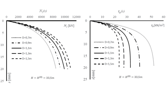 Rys. 6. Wpływ zmiany średnicy na przebieg krzywej obciążenia N2(s) oraz mobilizację oporu pobocznicy τśr(s) pala o długości 33,5 m