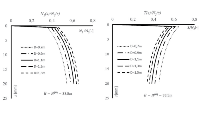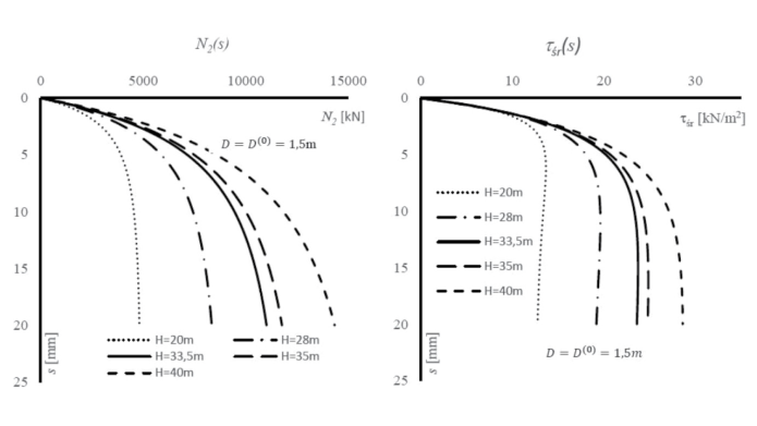 Rys. 8. Wpływ zmiany długości na przebieg krzywej obciążenia N2(s) oraz mobilizację oporu pobocznicy τśr(s) pala o średnicy 1,5 m