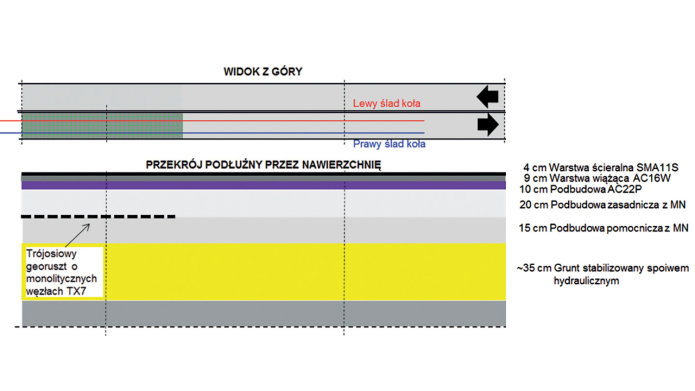 Badania terenowe są realizowane na użytkowanej drodze o przekroju 1 x 2 (fot. 1) i układzie warstw jak na rys. 10. Istotą obserwowanego odcinka jest zainstalowana wkładka georusztu w sekcji A pod warstwą podbudowy zasadniczej z niezwiązanej mieszanki. Droga obciążona jest ruchem KR4. Badania odcinka polegały, m.in. na cyklicznym pomiarze ugięć nawierzchni [...]
