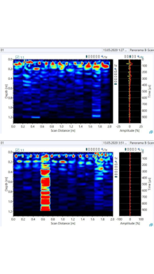 Rys. 14. Echogram ultradźwiękowy zarejestrowany wzdłuż linii 1 w polach P1 i P4