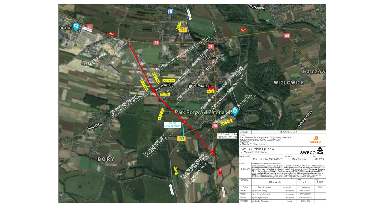 Nowa obwodnica to trasa o długości 2,1 km, która uzupełni układ dróg lokalnych wokół Zatora i zmieni ruch w mieście. Rozpocznie się na skrzyżowaniu DK44 i DW781 (ul. 1-go Maja) i pobiegnie do stacji paliw przy DK28 (ul. Wadowicka).