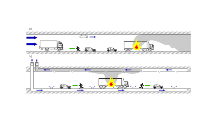 Wentylacja wzdłużna nie jest preferowanym systemem dla tuneli dwukierunkowych, ponieważ system ten gwarantuje właściwe warunki ewakuacji tylko po jednej stronie źródła pożaru. Zazwyczaj zakłada się, że w przypadku tuneli jednokierunkowych pojazdy znajdujące się za źródłem ognia mogą opuścić tunel. Jednak w przypadku utrudnionego ruchu czy zatoru na drodze wiele osób może znaleźć się w strefie objętej zadymieniem, gdy aktywuje się system wentylacji wzdłużnej. Dlatego w tunelach o wysokim ryzyku zatoru odległości między wyjściami awaryjnymi powinny być wystarczająco krótkie, aby zapewnić skuteczną ucieczkę. Szczególnie ważne jest szybkie wykrywanie i ostrzeganie, aby dać użytkownikom jak najwięcej czasu na dojście do wyjść awaryjnych.
