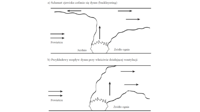 spowodowane niewystarczającą prędkością krytyczną, b) rozprzestrzenianie się dymu