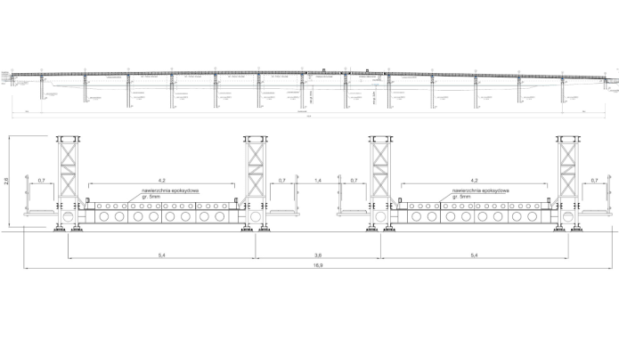 W celu optymalnej realizacji robót został zaprojektowany tymczasowy most objazdowy oddalony 2 km na zachód od miejsca dawnego mostu pontonowego. Most zaprojektowano jako konstrukcję składaną DMS-65 [2]. Posadowienie mostu przyjęto na wbijanych palach rurowych o średnicy 508 mm. Długość całkowita obiektu wynosi ok. 540 m z przęsłami o rozpiętości 39 m. Most składa się z dwóch niezależnych i równoległych konstrukcji dla każdej jezdni. W związku z lokalizacją mostu w miejscu dawnej przeprawy pontonowej most tymczasowy wpisywał się [...]