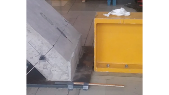 Elementy zostały przebadane w schemacie trójpunktowego zginania. Model prefabrykatu został ustawiony na specjalnie zaprojektowanym stanowisku badawczym wyposażonym w rozpory w miejscach wezgłowi łuku. Obciążenie było przykładane w kluczu łuku za pomocą siłownika hydraulicznego generującego maksymalne obciążenie o wartości 630 kN. Obciążenie z siłownika było rozkładane na całą szerokość badanego elementu za pośrednictwem belki trawersowej z kształtownika HEA 240. Podczas badań były prowadzone ciągłe pomiary siły w siłowniku oraz przemieszczeń i odkształceń konstrukcji. Wizualizację oraz widok prefabrykatu na stanowisku badawczym przedstawiono na rys. 3.