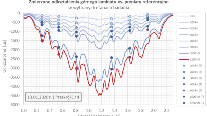 Dzięki wykorzystaniu różnych układów bądź zjawisk optycznych możliwe jest realizowanie pomiarów z wykorzystaniem pojedynczego czujnika światłowodowego (np. siatki Bragga, interferometry Fabry'ego-Perota). Jednak dzięki zjawiskom rozpraszania światła (rozpraszanie Rayleigha, Brillouina lub Ramana) pomiary mogą być wykonywane na całej trasie pomiarowej (długości czujnika światłowodowego), dzieląc go na szereg wirtualnych odcinków (punktów pomiarowych), których końce przylegają do siebie, tworząc ciągły łańcuch pomiarowy. Z punktu widzenia monitorowania konstrukcji inżynierskich taki sposób można uznać za pomiar geometrycznie ciągły. Możliwe jest realizowanie pomiarów odkształceń z rozdzielczością geometryczną wynoszącą np. 5 mm, co odpowiada 200 punktom pomiarowym na jeden metr czujnika [6, 7]. Dzięki temu w ostatnich latach zaobserwowano wyraźny wzrost liczby praktycznych zastosowań systemów pomiarowych DFOS. Liczne przykłady, z uwzględnieniem perspektywy historycznej, zostały przedstawione w pracach [8-12]. Dotyczą [...]