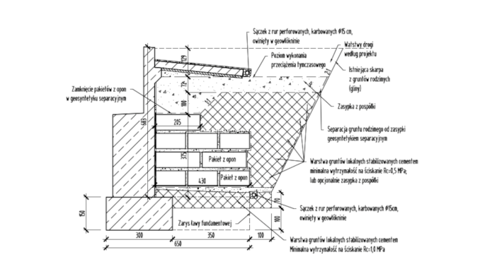 Pakiety z opon łącznie z przewarstwieniami z piasku średniego o grubości 10-15 cm zostały zamknięte w geosyntetyku separacyjnym. Wbudowany blok gumowo-gruntowy z całości został ulokowany w strefie między ścianami bocznymi przyczółków. A także przykryty warstwą gruntów niespoistych zagęszczonych, płytą przejściową i konstrukcją nawierzchni. W celu minimalizacji odkształceń innowacyjnej zasypki zastosowano czasowe jej przeciążenie (7 dni), (rys. 10). Po upływie roku od otwarcia obiektu nie zaobserwowano żadnych deformacji pionowych w strefie dojazdu do obiektu mostowego.