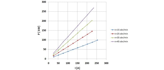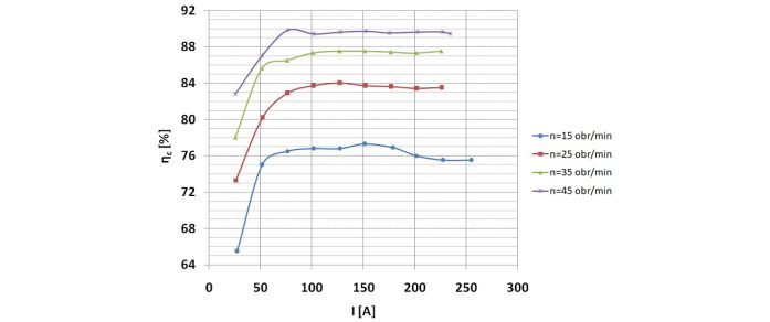 Na podstawie dokonanych pomiarów wyznaczono charakterystyki eksploatacyjne silnika. Na rys. 5-6 przedstawiono charakterystyki mocy mechanicznej oraz sprawności układu napędowego w funkcji prądu obciążenia dla wybranych wartości prędkości obrotowych. Współczynnik sprawności napędu bezprzekładniowego w zakresie obciążenia do 0,5 momentu znamionowego i prędkości obrotowej 45 obr./min jest o ok. 8-10% wyższy w stosunku do analogicznego rozwiązania układu napędowego z silnikiem indukcyjnym i przekładnią mechaniczną. W skali całego „cyklu życia” przenośnika pozwala to na znaczne ograniczenie kosztów eksploatacyjnych [4].