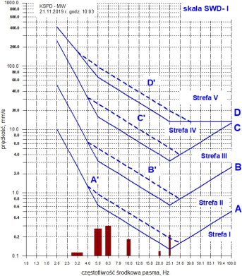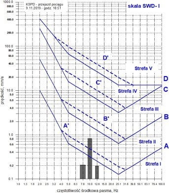 Jak wynika z rys. 4 i 5, oddziaływanie drgań wzbudzanych przejazdem pociągu jest o wiele istotniejsze, a jeżeli weźmie się pod uwagę liczbę zdarzeń w ciągu dnia, to przede wszystkim ruch pociągów powinien być brany pod uwagę w ocenie oddziaływania drgań na budynek.