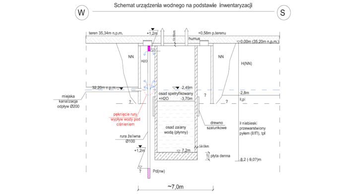 Ze względów na niemożliwość wykonania pełnych badań przedstawiono istotne dane inwentaryzacyjne stanowią syntetyczne odwzorowanie najbardziej prawdopodobnego z możliwych posadowienie Urządzenia Wodnego (UW).