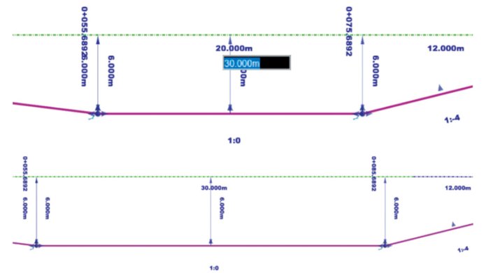 Przedstawiona wyżej definicja umożliwia szybką i różnorodną modyfikację zatoki. Można np. zmienić jej usytuowanie. Trzeba ją wskazać, złapać za manipulator pierwszego skosu i przesunąć w wybrane miejsce. Cała zatoka przesunie się, ponieważ jest dowiązana do skosu wjazdowego. Nie jest również istotny kształt osi drogi – zatokę można [...]