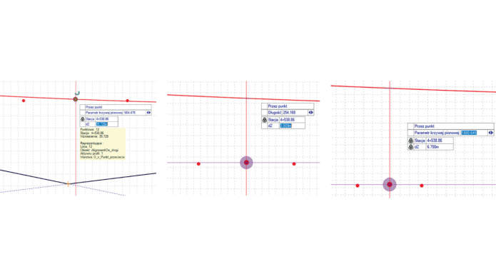 - wyznaczyć punkty krawędzi drogi poprzecznej oraz wyświetlić je (wraz z osią) na profilu trasy głównej,
