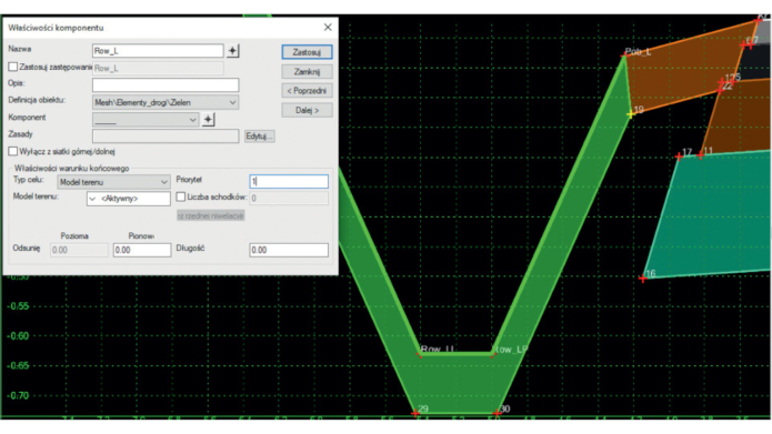 - Zdefiniowanie poszerzenia jezdni przez zastosowanie Więzu poziomego obiektu {ang. Horizontal Feature Constraint}
