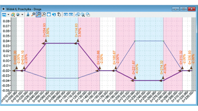 - w planie – brak koloru opisującego pochylenie na pasie przechyłki,