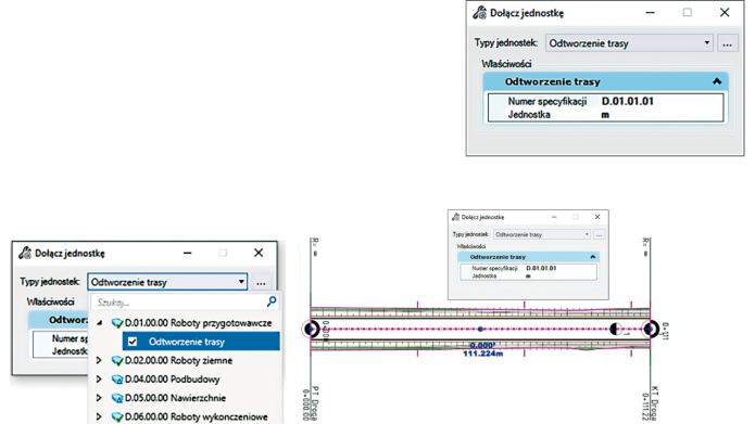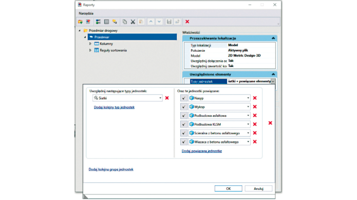 Należy utworzyć przedmiar obejmujący konstrukcję nawierzchni i roboty ziemne na podstawie przypisanych do modelu atrybutów BIM (opisane powyżej) oraz wygenerowanych brył robót ziemnych.