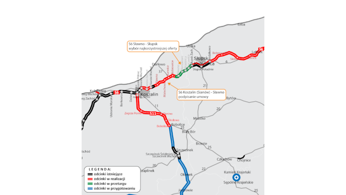 GDDKiA podpisała umowę na realizację drogi ekspresowej S6 na odcinku Koszalin - Sławno. Wykonawcą realizacji zostało konsorcjum firm Kobylarnia i Mirbud, a wartość kontraktu to 657,9 mln zł. Nowa trasa będzie dwujezdniową drogą ekspresową o dwóch pasach ruchu w każdym kierunku i długości 23,2 km. Zakończenie inwestycji przewiduje się na koniec sierpnia 2025 roku.