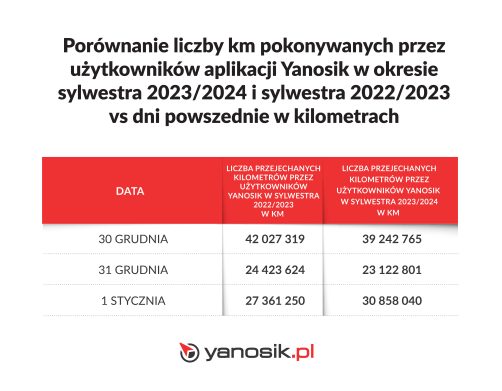 Liczba przejechanych kilometrów 1 stycznia 2024 roku wypadła jednak znacznie lepiej niż w 2023 roku. Zgodnie z porównaniem Yanosika, w tym roku kierowcy pokonali o prawie 3,5 mln więcej kilometrów.