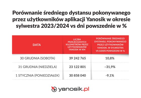 W ostatni dzień 2023 roku aktywność kierowców znacznie spadła. W niedzielę 31 grudnia w systemie Yanosik zarejestrowano ponad 30% spadek średniego dystansu pokonywanych kilometrów. Nieco mniejszy spadek zarejestrowano również 1 stycznia.