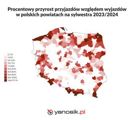 Zgodnie z danymi z systemu Yanosik największy współczynnik przyjazdów, względem wyjazdów w wybranych częściach kraju, można zaobserwować na południu: w województwach dolnośląskim, opolskim, śląskim, małopolskim i podkarpackim oraz w północnej części: w województwach zachodniopomorskim, warmińsko-mazurskim i podlaskim.