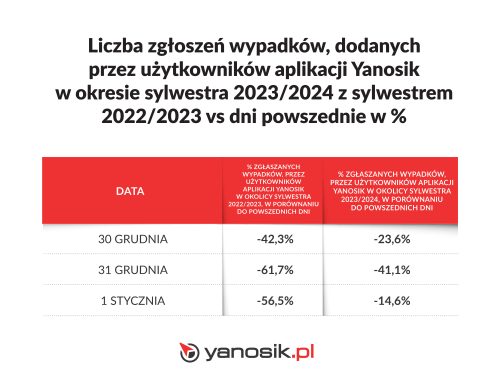 Dane Yanosika wykazują, że kierowcy również zgłaszali w tym roku mniejszą ilość wypadków na trasie, w porównaniu do ubiegłorocznego świętowania nadejścia nowego roku.