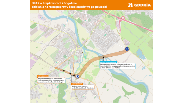 Planowana inwestycja w zakresie drogi krajowej obejmuje odcinek od ronda z DW409 do skrzyżowania z DW416 w kierunku Żywocic. Inwestycja pozwoli na przywrócenie ciągłości DK45, przerwanej na skutek powodzi. Przetarg obejmuje odbudowę drogi na odcinku 1,2 km, rozbiórkę i budowę dwóch mostów na Osobłodze, przebudowę i odbudowę chodnika wraz z poboczem na całej długości oraz odtworzenie odwodnienia drogi.