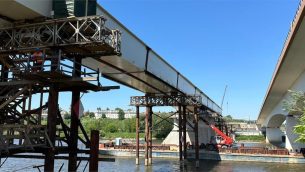 Zakończył się etap nasuwania 300-tonowego elementu stalowej konstrukcji mostu w Sandomierz