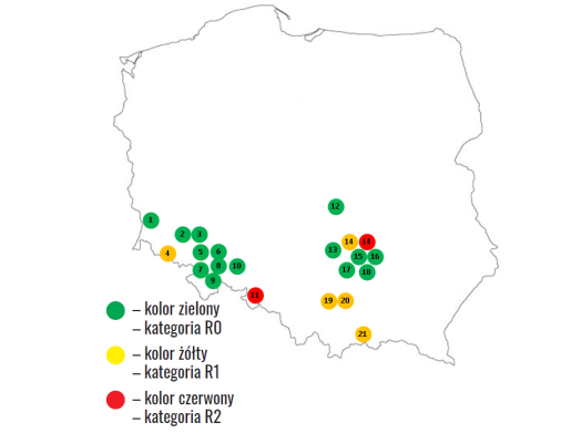 Rys. 2. Reaktywność wybranych kruszyw łamanych uzyskanych z przekruszenia skał o genezie lodowcowej i rzeczno-lodowcowej (badanie wg ASTM C 1260 – odpowiednik PB/1/18). Oznaczenia: kolor zielony (nr 9 i 10b) – kategoria reaktywności R0; kolor czerwony (nr 2b, 6 i 17) – kategoria R2; kolor żółty (pozostałe) – kategoria R1