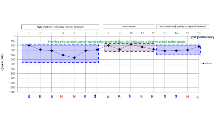 Obserwując tak duże ugięcia, należy podkreślić, że znacząco przekraczają ugięcia typowych nawierzchni. Co za tym idzie prawdopodobnie wzdłuż krawędzi płyty powodują bardzo duże naprężenia w macie wibroizolacyjnej. Mata ta, będąc elastycznym materiałem, może ulegać trwałym deformacjom. Czego skutkiem może być dalsza degradacja nawierzchni, prawdopodobnie obserwowana w przypadku torowiska w lokalizacji E.