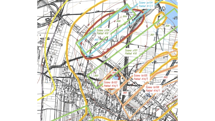 Niespełna 4,5 km dalej, w rejonie km 6+100 A1a, po prawej stronie znajduje się szyb Aniołki pełniący funkcję szybu wentylacyjnego. Tego typu obiekt wymaga utworzenia filaru ochronnego, który wyraźnie widać na rys. 6 (obszar poza szrafem). Dlaczego jest to istotne dla eksploatacji autostrady? Dlatego, że pewna część górotworu nie ulega deformacjom w takim tempie jak pozostała. Prowadzi to do sytuacji, w której powolnym ruchem narastają różnice pomiędzy wschodnią i zachodnią linią autostrady, zwiększając tym samym różnicę w nachyleniu. Oceniając sytuację, nasuwa się pytanie, czy projektując przebieg autostrady, uwzględniono tę istotną kwestię.